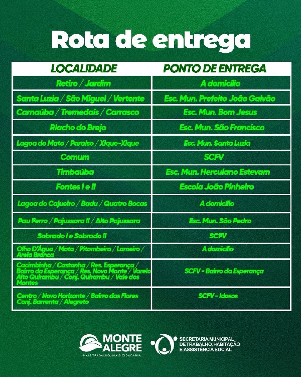 A Prefeitura de Monte Alegre, por meio da Secretaria Municipal de Trabalho, Habitação e Assistência Social, realizará nesta terça-feira, 27 de janeiro, a entrega das cestas básicas para as famílias beneficiadas.