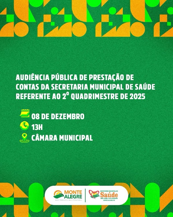 A Secretaria Municipal de Saúde apresenta, no dia 03 de dezembro, às 13h30, a Audiência Pública de Prestação de Contas do 2º quadrimestre de 2025, na Câmara Municipal.