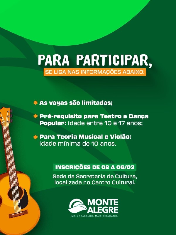 Vão abrir as inscrições para as aulas de Teoria Musical, Teatro e Dança Popular e Violão da Secretaria de Cultura.